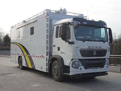 該車選用**重汽汕德卡牌二類底盤為平臺改裝而成。在駕駛室頂部 安裝有導(dǎo)流罩,廂體設(shè)計有鋁合金登頂梯,方便人員登頂檢修、瞭望,車 頂四周裝配裝飾套件,使整車外觀輪廓和線條更加美觀圓潤、動感流暢。